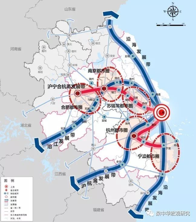 按照2016年的规划,长三角地区将构建“一核五圈四带”的空间格局。长三角将以上海为龙头,推动南京都市圈、杭州都市圈、合肥都市圈、苏锡常都市圈、宁波都市圈的同城化发展,强化沿海发展带、沿江发展带、沪宁合杭甬发展带、沪杭金发展带的聚合发展,形成“一核五圈四带”的空间格局。