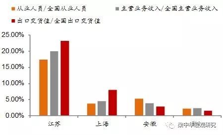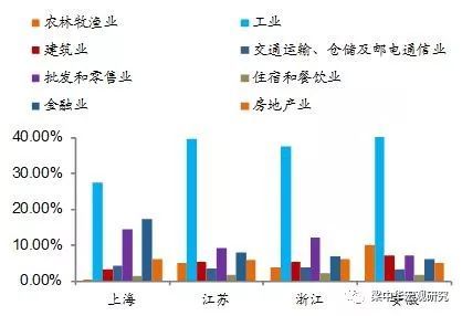 第二,产业体系完备,区域经济互补性强,创新潜力较大。上海第三产业发达,金融业以及批发零售行业占比高,浙江依托信息经济优势,金融业、批发零售业独具特色,江苏、安徽制造业占比较高,其中江苏高技术制造业具有明显优势。