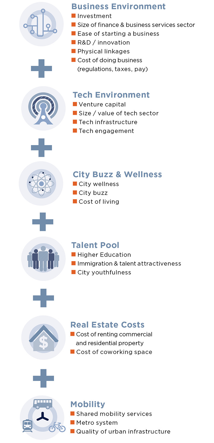衡量全球科技城市指数的六个大类指标(来自Savills报告Tech Cities in Motion)