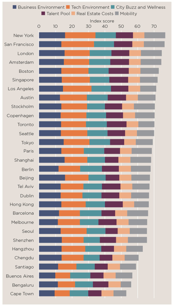 Savills科技城市指数可不是一个粗线条的衡量指标,它通过100个单独指标衡量了来自世界各地30个城市的发展情况:大到流入城市的风投资本规模,小到一杯咖啡的成本,以此来确定哪些城市在孕育科技与初创公司方面成为最大赢家。
