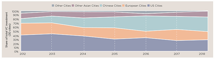 在2012-2018年期间,虽然美国科技城市吸引的风投规模有所增加,但这一规模占全球风投资本的份额已由40%下降到28%(如下图所示)。相比之下,中国科技城市占全球风投资本的比例在同一时期从11%迅速扩张到36%,表现尤为亮眼。