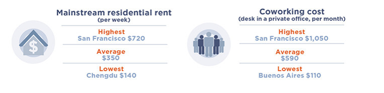 相比之下,成都的主流住宅租金最低,为140美元/周,平均值为350美元/周;而布宜诺斯艾利斯的办公室租金成本最低,每个工位的租金为110美元/月,几乎是旧金山的十分之一,而平均数则为590美元/月。