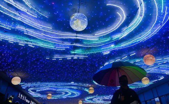 2月13日,浙江省嘉兴市中山路旭辉广场,太空彩灯如同科幻片一样挂在头顶,演绎真实版《流浪地球》。视觉中国供图