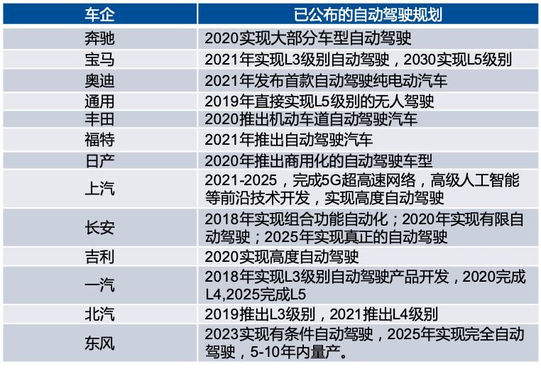 此前,《智能汽车创新发展战略》中提到“2020年智能汽车新车占比达到 50%、高速公路的车用无线通信网络(LTE-V2X)覆盖率达到 90%”,我们对整车厂无人驾驶相关布局的跟踪情况佐证了这一点。