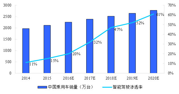 目前中国ADAS整体渗透率很低,根据汽车工业协会的数据,2015年渗透率为15%(单车具备任何一种ADAS功能即算),预计这一比重将在2019年超过50%,呈快速上升趋势。