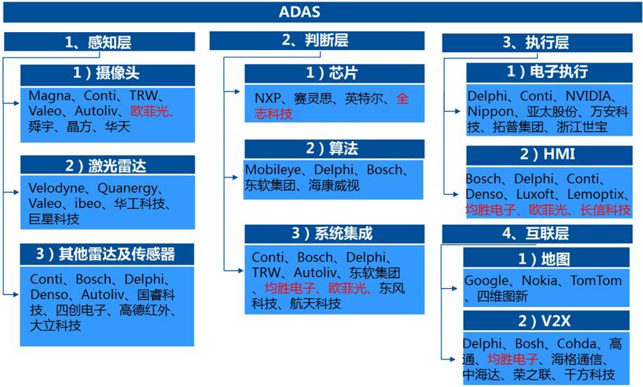ADAS系统主要由感知层、判断层、执行层和互联层四个层级组成,每个层级都有不同的受益设备商。