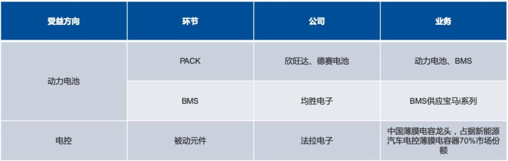 新能源汽车产业链对下游最大的拉动是动力电池环节,包含材料、电芯、PACK、BMIC、BMS全产业链。从燃油机向电动机的转变,也带来了电控的增量需求,对电子行业公司来说基于在于被动元器件、功率半导体的增量需求。