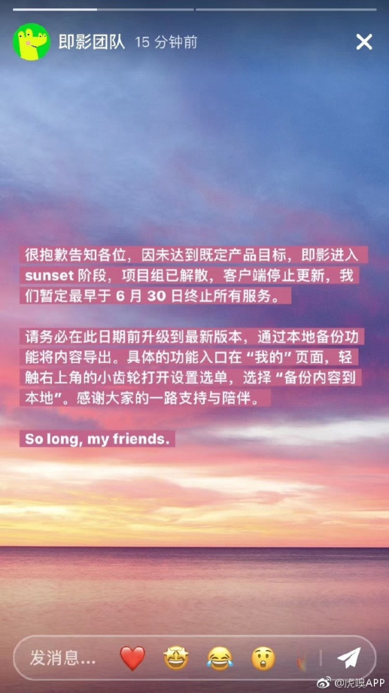 据虎嗅网4月15日消息,知乎旗下短视频APP“即影”发布公告称,因未达到既定产品目标,“即影”进入sunset阶段,项目组已解散,客户端停止更新,暂定最早于6月30日终止所有服务。