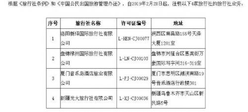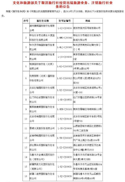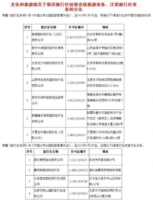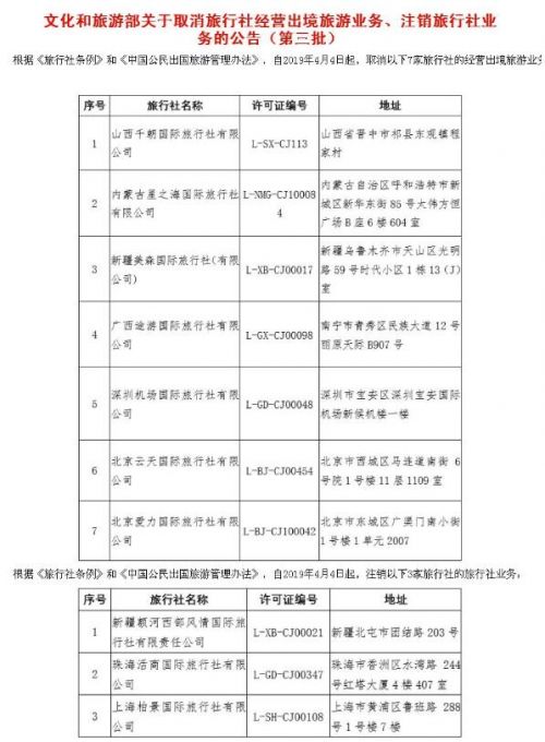 文化和旅游部近日发布公告,取消7家旅行社的经营出境旅游业务,注销3家旅行社的旅行社业务。记者注意到,截至目前,今年文化和旅游部共取消30家旅行社的出境游业务、注销11家旅行社的旅行社业务。戳图看详细黑名单。(记者 李金磊)