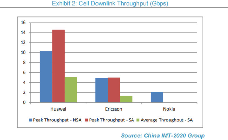 此次报告直接引用了中国IMT -2020小组的测试结果,该小组对几家主要供应商的5G运行解决方案进行了5G NSA和SA组网测试,测试结果分别于2018年9月和2019年1月公布。