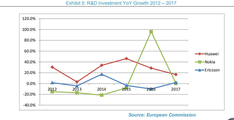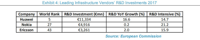 根据报告引用的2018年欧盟工业研发投资记分板显示,这三家5G基础设施供应商都在全球研发投资排名前50位的公司中名列前茅,其中华为排名第五、诺基亚排名27、爱立信排名43。