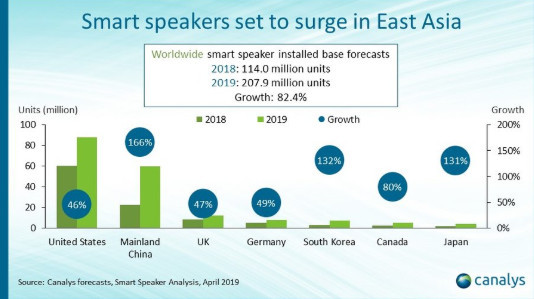 Canalys公司预测,就全球各地智能音箱的发展情况而言,美国将继续保持其领先地位,在未来几个月增长46%,但中国、韩国和日本的增长率将分别达到166%(从2000万台到5990万台)、132%和131%。在其他地方,它预计加拿大的智能音箱市场将增长80%,德国的智能音箱市场将增长49%,英国智能音箱市场将增长47%。