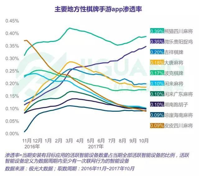 第三方调研机构极光大数据所公布的《2017年中国地方性特色棋牌游戏研究报告》显示,闲徕互娱旗下的《熊猫四川麻将》高居手游App渗透率榜首,达到了0.39%;而排行榜中下一款四川本地的麻将游戏《皮皮四川麻将》,渗透率仅有0.09%,相比之下前者在四川的麻将棋牌游戏中几乎达到了垄断的位置。