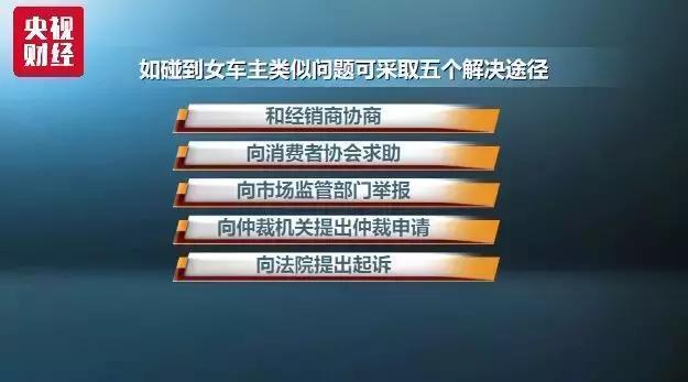 法律专家介绍,如果碰到女车主类似的问题,可以采取的解决途径有五个,分别是和经销商协商,向消费者协会求助,向市场监管部门举报,向仲裁机关提出仲裁申请,向法院提出起诉。同时,对于汽车这类耐用品,举证责任在商家一方。