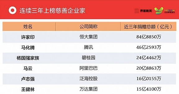 与此同时,界面还公布了连续三年上榜慈善企业家,许家印同样位列榜首,84.89亿的三年捐赠总额,超过了第二位马化腾和第三位杨国强家族的捐款总和。