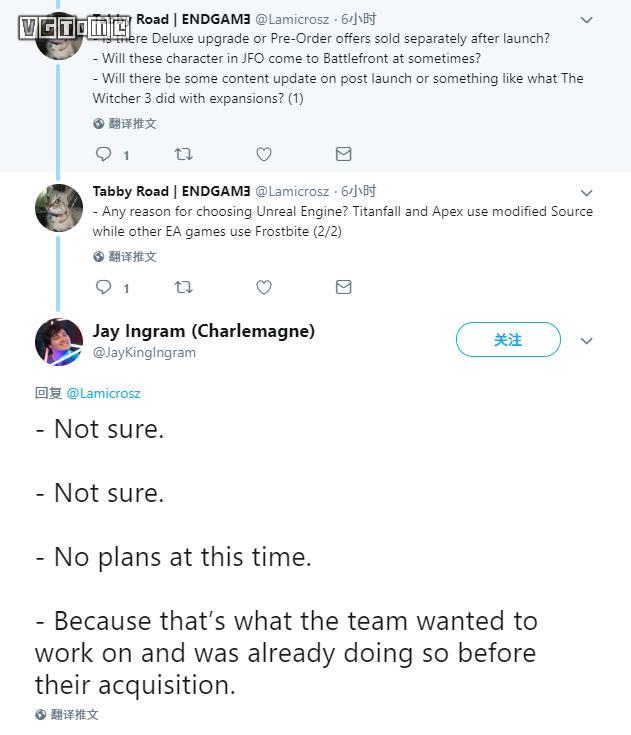 Respawn 没有使用 EA 强推的寒霜引擎,而是使用了虚幻引擎开发本作,这是工作室自己的选择。此外,豪华版内容是否会单独发售?本作人物是否会加入《星战前线》?有没有类似《巫师3》那样的大型扩展包更新?这些都还没有明确的规划。
