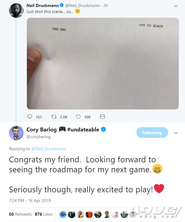 来自顽皮狗工作室的《最后生还者2》游戏总监Neil Druckmann今天在推特发文表示,本作已经完成了剧本上最后一幕的拍摄。《战神》总监Cory Barlog在回复中送上了祝贺,他也表示期待能够了解游戏的具体规划并为自己的下一款作品提供参考。