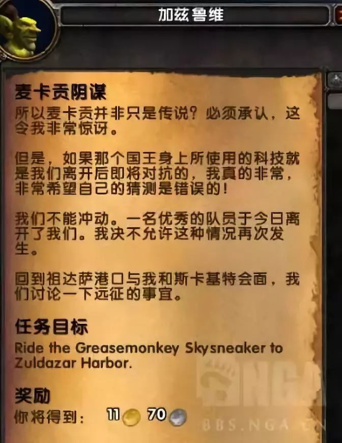 在祖达萨我们可以看到加兹鲁维在找你,说联盟在伯拉勒斯港对一处宝库探索。加兹鲁维对宝库内的科学技术心驰神往,邀请我们一起。