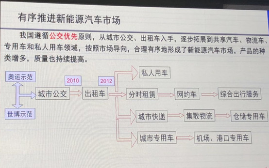 万钢说,发展新能源汽车的初衷是为了节能减排,降低碳排放量,因此在未来要继续坚持这一发展战略。从整个市场的布局上遵循公交优先的原则,从公交车、出租车入手,逐步拓展到共享汽车、物流车、专用车和私人汽车领域,合理有序地形成新能源汽车市场。