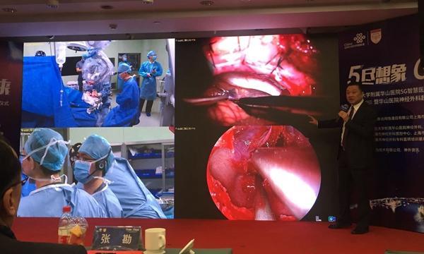 日前,20公里外的复旦大学附属华山医院西院,正在进行的两台神经外科手术——由王镛斐教授主刀的内镜经鼻蝶垂体瘤切除术和陈亮教授主刀的枕下乙状窦后入路治疗桥脑海绵状血管瘤,通过5G网络几乎无时延地呈现在上海联通大厦主会场的屏幕上。