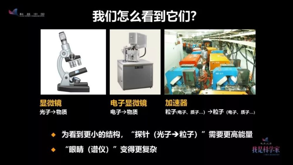 大家可能都用过显微镜,最早我们用眼睛看,用的是光波;但是如果想看的东西比光的波长还要小,就看不到。怎么办?我们用电子显微镜,因为电子的波长比光子要小得多。再小一点怎么办?我们需要用加速器把电子或质子的能量加速到很高的程度。能量越高,能看到的物质的结构越小。