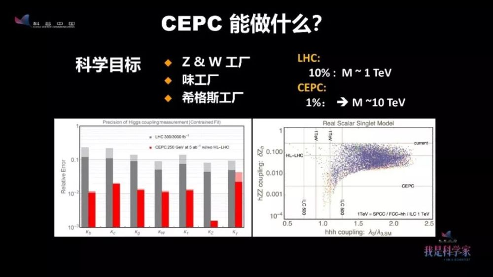 在欧洲核子研究中心,Higgs粒子已经被看见了,我们可以做Higgs粒子性质的研究。但问题在于,看左边这张图,现在的大型强子对撞机,研究Higgs粒子的性质只能到大约10%的精度(图中灰色部分)。10%,在新物理的能标相当于1个TeV左右。如果能够提高精度到10倍,就可以把能标提高到10个TeV,就能解决刚才提到的自然性的问题。