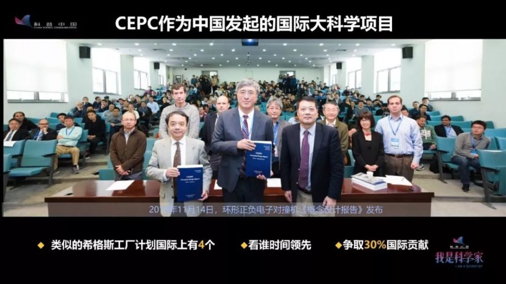 这是我们的概念设计报告的发布会。国际上类似的装置一共有四个:两个直线对撞机,两个环形对撞机。我们做的是其中的一个环形对撞机,欧洲核子中心有一个直线对撞机、一个环形对撞机,另外日本有一个直线对撞机。我们希望中国在这一次能够在时间上领先。