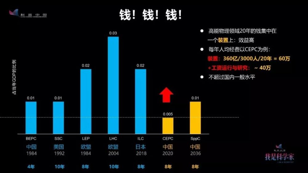 科学院的人均经费大约每人每年100万。我们算一下,建设 CEPC装置,360亿除以3000人除以20年,得到每人每年60万;再加上工资、运行、研究40万左右。如果按领域平均,现在基础研究经费有900亿,除以6个领域,数理化天地生。我们在物理当中如果只占1/5,一年也有30亿。所以大家可以看到,我们建这样一个装置,能用20年,投入不算多,不超过国内一般水平。这是我们高能物理作为一个重要的基础科学研究领域应该得的钱,是我们特有的研究形式。所以拜托大家支持我们做这样一个装置。
