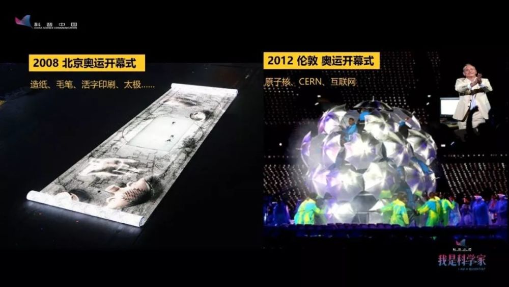 2008年的北京奥运会,大家可能对开幕式印象很深,我们有造纸、毛笔、活字印刷,还有太极,非常震撼;而2012年的伦敦奥运会,开幕式拿出来的是原子核,万维网(WWW)的发明人、欧洲核子研究中心的伯纳斯·李先生——从中可以看到差距:我们的未来应该在科技,我们不能躺在前人的成就上、永远沉湎其中,而是应该有新的东西。