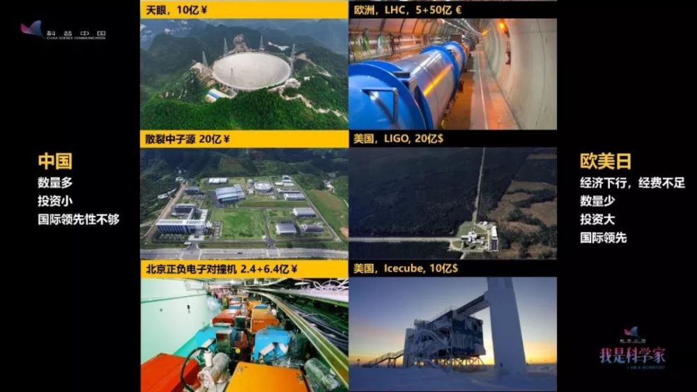 中国现在的大科学装置,数量很多。500米口径球面射电望远镜“天眼”(FAST)10亿人民币,中国散裂中子源(CSNS)20亿人民币,北京正负电子对撞机(BEPC)8.8亿人民币。而欧洲的大型强子对撞机(LHC)项目55亿欧元,发现引力波的激光干涉引力波天文台(LIGO)20亿美元,美国在南极冰立方中微子望远镜(IceCube)10亿美元,我们总体的规模差了10倍,我们的国际领先性不够,在于老说大科学装置贵——其实,我们做很多小型的,不如建一个大型的。