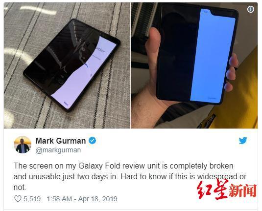 彭博社科技测评记者马克·古尔曼称,他的“测评用机竟在使用短短两天内就完全坏了,无法使用。”在其发布的一系列推文中,马克记录了在取掉屏幕保护膜后,屏幕是如何破裂的过程。