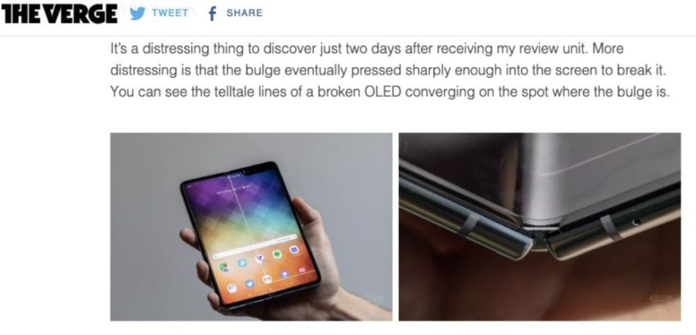 The Verge 报道,记者在使用 Galaxy Fold 手机一天之后,就看到屏幕上出现突起物,屏幕也出现轻微的变形,该记者也强调并没有不当使用手机,就只是像普通电话一样使用,比如打开、关闭,把它放在口袋里。