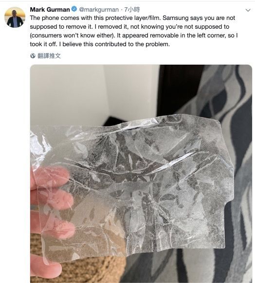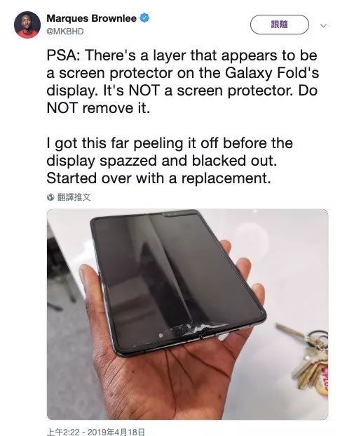 Bloomberg 记者也在推特上发文指出,手机用了两天屏幕就坏了,后来他注意到 Galaxy Fold 外观上有一个看起来像屏幕保护膜的东西,可能是他不经意取下来,导致荧幕破损,后来询问三星,才知道不该撕开这个类似保护层的东西,但是消费者拿到手机时,并不会知道不应该取下来。另外,科技评论员 Marques Brownlee 也遇到了类似问题,并强调不要将其撕开。