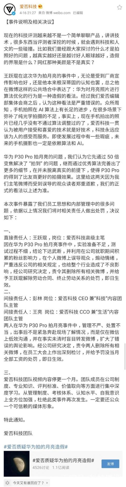 然而,华为手机照相功能评测事件还未就此结束。4月16日,爱否科技以王跃琨“选择性发布素材黑厂商”为由,将其开除。