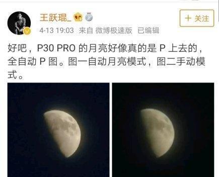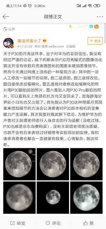 此后事情又有反转。因此事件对王跃琨发表过人身攻击的微博大V魔法师但小丁,发布了致歉微博。通过他的微博内容可知华为P30 pro拍摄月亮的复现方法,可以确认的是,华为的P30 Pro官图确实存在AI细节补充。