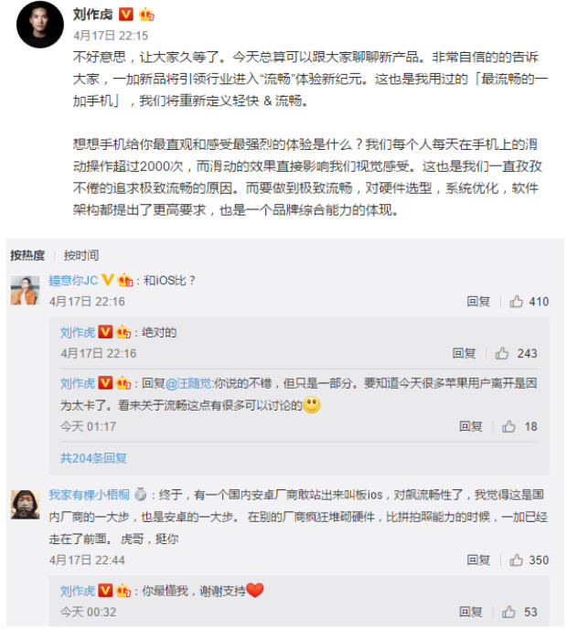 这次的一加7也是如此,刘虎作更是夸下海口,称一加7是他用过最流畅的手机,将引领整个行业进入流畅新纪元。而这个流畅并不是安卓手机相比,更是和号称无法超越的苹果iOS系统相比!刘作虎甚至表示,很多苹果手机用户离开就是因为太卡了。
