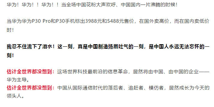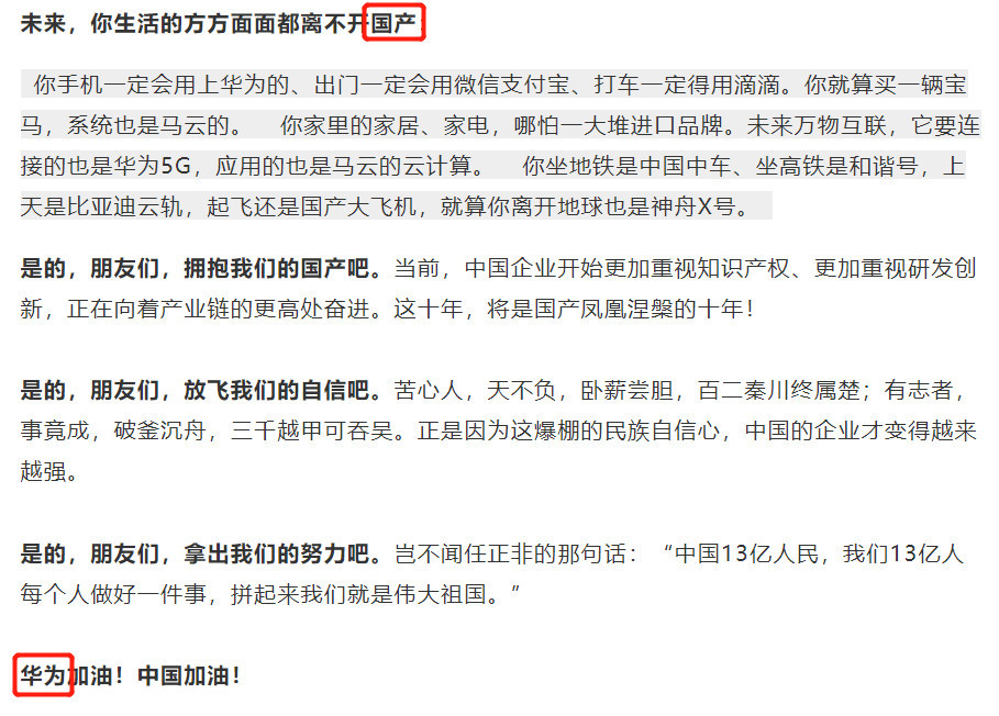 例如某一篇“沸腾文”中的春秋笔法,上文里还说支持国产,但到了下文国产一词怎么就被替换成“华为”了呢?这不太好吧?