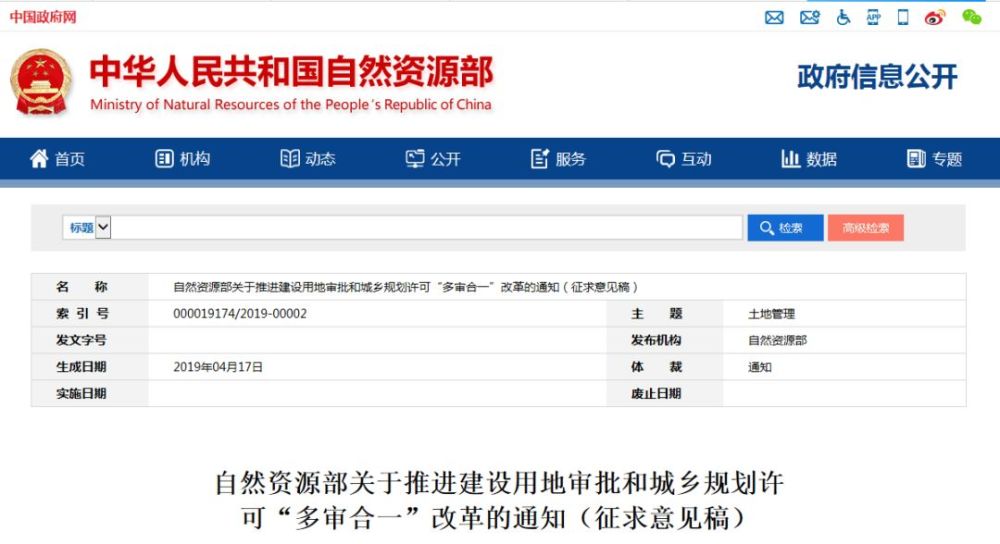 房地产导刊讯:4月17日,自然资源官网部发布《关于推进建设用地审批和城乡规划许可“多审合一”改革的通知》(征求意见稿)公开征求社会各界意见,征求意见截止时间为2019年5月2日。