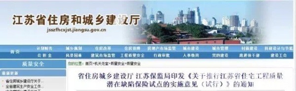 事实上,江苏已经开始相关探索。去年,江苏省住建厅、省保监局联合制定《关于推行江苏省住宅工程质量潜在缺陷保险试点的实施意见(试行)》,目前这项工作在镇江市和泰州一些项目进行试点。