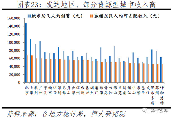 一线城市人均储蓄存款、可支配收入分别高达11.5、6.6万元,远高于其他城市。绝对购买能力不仅是可支配收入,还应包括人均储蓄存款,尽管当前“存款搬家”现象明显,但仍能反映相关情况。从城乡居民人均储蓄存款看,2017年一线、二线城市分别为11.5、6.6万元,三线、四线城市分别为4.1、3.2万元。从城镇居民可支配收入看,2017年一线、二线城市分别为6.4、4.5万元,三线、四线城市分别为3.6、3.1万元。此外,包头、鄂尔多斯、呼和浩特等部分资源型城市人均储蓄存款及可支配收入也较高。