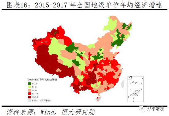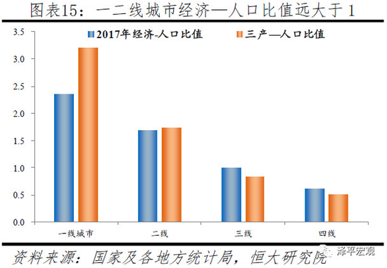 一二线城市以25.5%的人口创造了46.5%的GDP,人口集聚潜力很大。当前一线城市以5.2%的人口创造了全国12.3%的GDP,二线城市以20.3%的人口创造了34.1%的GDP,三线城市的人口份额与经济份额基本持平、分别为33.9%、34.0%,四线城市的人口份额明显低于经济份额、分别为39.7%、24.5%(因统计问题,地区GDP合计与全国存在差异)。从经济—人口比值来看,2017年一、二、三、四线城市分别为2.4、1.7、1.0、0.6;从剔除工业因素的第三产业-人口比值看,2017年一、二、三、四线城市分别为3.2、1.7、0.8、0.5。从经济增速看,2015-2017年,一线、二线、三线、四线城市年均经济增速分别为7.5%、7.9%、7.8%、6.8%,四线经济规模基数小、但增速仍然乏力。从区域看,近几年经济增速比较低的地区是辽宁、山西等数据挤水分地区及东北、西部等偏远地区,经济增速多在6%以下;而中部不少地区经济增速在8-10%之间,西南部分地区更是在10%以上。总体上看,未来人口将继续向大都市圈和区域中心城市集聚,三四线城市全域人口未来将继续大幅流出。