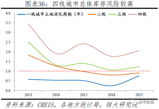 从广义库存看,西部地区、四线城市库存偏高,2017年土地消化周期分别为2.5、2.1年。分地区看,东部、中部、东北地区库存持续改善,西部地区库存改善力度明显不足。2017年,东部、中部、东北地区土地消化周期均在1.15-1.35年之间,而西部地区则高达2.5年。分线城市看,2017年一线、二线、三线、四线城市土地消化周期分别为0.8、0.9、1.2、2.1。尽管一线城市受2016年930开始的调控收紧影响,市场销售持续降温,但土地消化周期基本小于1;四线城市销售乏力,土地供应持续增加,仍有较大库存风险。