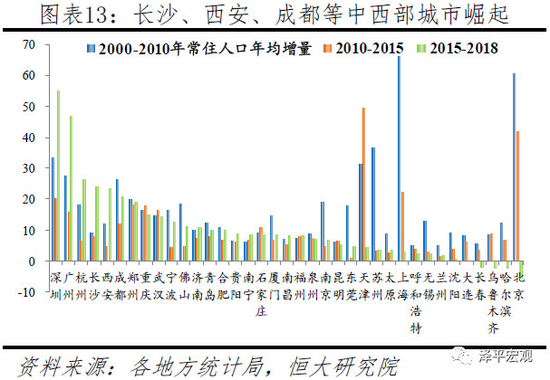 从重点城市看,深圳、广州、杭州常住人口大幅增长,西安、成都、长沙等中西部核心城市日益崛起,北京、上海、天津、苏州、无锡等东部城市人口增长明显放缓。过去二十年,城市的人口集聚格局发生深刻变化。除京沪从2013年开始主动控人外,其他城市近期多在“抢人”、但成效各异。2000-2010年,常住人口年均增量最大的前五个城市为上海、北京、苏州、深圳、天津,分别年均增加66、61、37、34、31万。2010-2015年,常住人口年均增量最大的前五个城市为天津、北京、上海、深圳、郑州,分别年均增加50、42、22、20、18万。2015-2018年,常住人口年均增量最大的前五个城市为深圳、广州、杭州、长沙、西安,分别年均增加55、47、26、24、23万;成都、郑州、重庆(主城)常住人口年均增加也超过15万,而传统的人口集聚大市北京、上海、天津、苏州、无锡年均增加不足5万,北京2017-2018年持续两年负增长、天津2017年一度负增长。