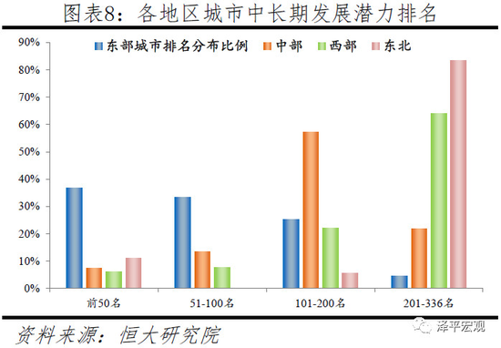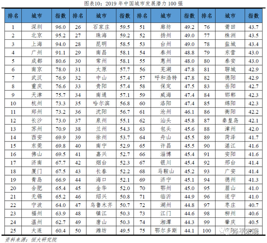 2019年深北上广稳居中长期发展潜力榜单前4名,二线城市中成都、南京、武汉、重庆、天津、杭州位居前十;东部地区有32座城市进入前50名,东北地区有超八成城市位于200名之后。百强城市以全国13%的土地,集聚50%的人口,创造约73%的GDP,占全国商品住宅销量的约62%。深圳占据城市发展潜力榜首,北京、上海、广州紧随其后。二线城市中,成都、南京、武汉、重庆、天津、杭州位列前10名;郑州、长沙、西安、济南、合肥等省会城市,厦门、青岛等计划单列市,苏州、东莞、佛山等发达地级市进入前20名。省会城市除呼和浩特、银川、西宁、拉萨外均排名前50。在前50名城市中,东部地区多达32个,中部、西部、东北地区分别有6、8、4个。除直辖市、省会城市和计划单列市外,前50名其余地级市大多分布在长三角、珠三角地区,其中长三角城市群8个,珠三角城市群4个,海西城市群、山东半岛城市群各2个。分地区看,东部、中部、西部地区排在200名之后的城市占比分别为4.6%、22%、64.1%;东北地区有30座城市位列200名之后,占本区域地级单位个数的83.3%,发展潜力总体靠后。需注意,各指标经标准化处理后合成的发展潜力指数仅具备序数意义。