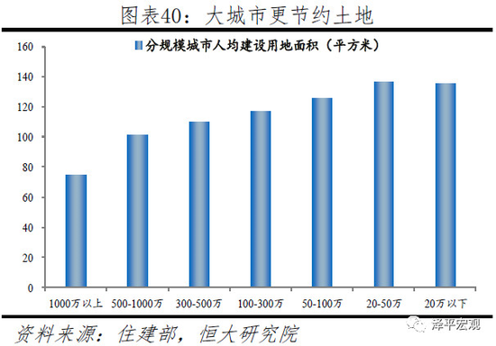 以中心城市为引领的都市圈城市群更具生产效率,更节约土地、能源,是支撑中国经济高质量发展的主要平台,是中国当前以及未来发展的重点。根据基本面排名,2019年发展潜力百强城市中有96个位于19大城市群,其中处于24个千万级大都市圈的有54个。2018年11月,国务院《关于建立更加有效的区域协调发展新机制的意见》要求,建立以中心城市引领城市群发展、城市群带动区域发展新模式,推动区域板块之间融合互动发展。以住建部城区常住人口为标准,将城市划分为1000万以上、500-1000万、300-500万、100-300万、50-100万、20-50万、20万以下七类。从人均生产效率看,分规模人均创造GDP呈现规模从大到小的递减现象;1000万人以上的城市人均创造14万元的GDP,是100-300万人城市的2.1倍,是20万人以下城市的约5倍。从人均城市建设用地看,大城市明显更节约土地资源,分规模人均创造GDP呈现规模从大到小的递增现象,2017年1000万人以上城市人均建设用地仅74.5平方米,而100-300万、20万以下城市分别为117.3、135.5平方米。
