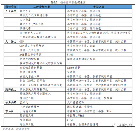 研究背景与分析框架:房地产市场进入总量平衡、区域分化的城市群时代。1)背景:房地产进入新周期,城市发展进入城市群都市圈时代。中国20-50岁人口于2013年见顶,存量住房套户比近1.1和房地产长效机制加快构建,标志着中国房地产市场告别高增长阶段,进入高质量发展的新时代新周期。在中长期,城镇化、居住改善、城市更新三大红利将支撑中国房地产市场未来平稳发展。从区域看,中国进入城市群都市圈时代,区域分化突出,城市发展潜力差异巨大,城市研究价值更加凸显。2)分析框架:基本面分析趋势,市场面分析时机。基本面分析是城市发展潜力研判的核心,关键在于研判人口,逻辑链条是:人随产业走,产业决定城市兴衰,规模经济和交通成本等区位因素决定产业布局。我们在基本面关注需求侧的人口现状、人口潜力和人口购买能力,以及供给侧的住房存量及土地财政依赖度,共涉及23个指标。在市场面,用房价周期、需求透支率、库存去化、地价房价比等波动较大的4个短期指标研判城市市场热度,以在基本面分析基础上判断进入时机。根据历史数据回测,准确度为75%。