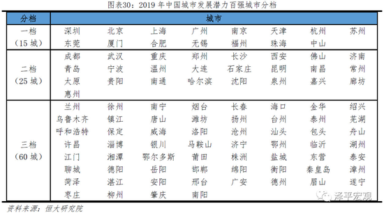 基本面:2019年中国城市发展潜力排名。1)榜单概览:2019年深北上广稳居中长期发展潜力榜单前4名,二线城市中成都、南京、武汉、重庆、天津、杭州位居前十;东部地区有32座城市进入前50名,长三角、珠三角地区表现尤其突出;东北地区有超八成城市位于200名之后。百强城市以全国13%的土地,集聚50%的人口,创造73%的GDP,占全国商品住宅销量的62%。2)人口现状:人口持续向大城市集聚,中西部核心城市崛起。从区域层面看,当前人口回流皖川桂豫等中西部省份与粤浙等东部省份人口再集聚并存,京沪津苏黑吉辽人口增长低迷甚至负增长。从分线城市看,人口持续向一二线大城市流入,三线城市全域流入流出基本平衡,四线城市持续流出。从重点城市看,深圳、广州、杭州常住人口大幅增长,西安、成都、长沙等中西部核心城市日益崛起,北京、上海、天津、苏州、无锡等东部城市人口增长放缓。3)人口潜力:人随产业走,一二线产业基础及潜力突出。一二线城市以25.5%的人口创造了46.5%的GDP,人口集聚潜力很大。在产业创新方面,一二线城市头部效应显著,上市公司占比、发明专利授权量合计分别占约70%、75%,其中京沪深占据绝对高地,杭州、广州、苏州、南京、成都等城市居前。在交通区位上,一二线城市占据交通枢纽地位,高铁始发终到趟数分别高达740、149趟,东部地区受益于自然地理和率先发展战略交通基础条件更优。在公共资源上,一二线城市优质教育、医疗资源密集,城市轨道交通提升城市运行效率。4)购买能力:一二线城市绝对购买能力较高,相对购买能力较低。从绝对水平看,一线城市人均储蓄存款、可支配收入分别高达11.5、6.6万元,远高于其他城市。从相对水平看,一线、二线、三线、四线城市房价收入比分别为20.8、10.6、8.4、6.0年,但一线城市因供给不足,房价并非由中位数收入人群决定,而是由高收入人群决定。5)住房供给:一二线城市住房供给偏紧,二三线土地财政依赖度较高。一二线城市住房供给偏紧、套户比分别为0.97、1.02,东北地区有过剩风险、套户比超过1.1。东部、中部土地财政依赖度较高,分别为57%、52%;二三线城市较高,分别为64%、50%。