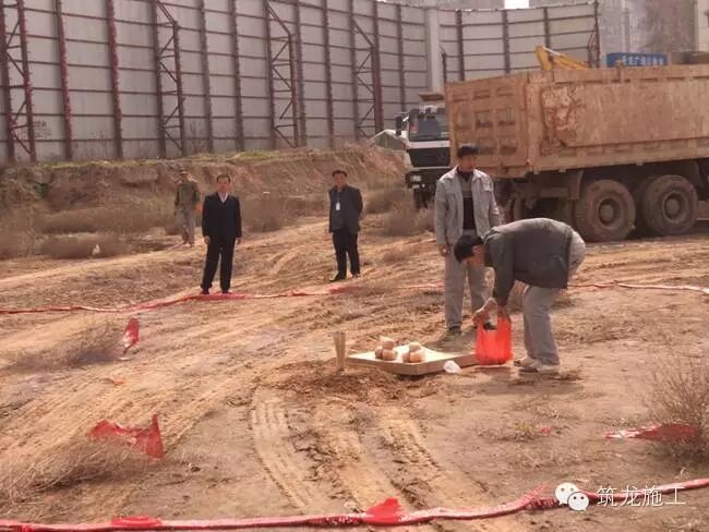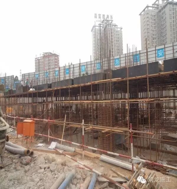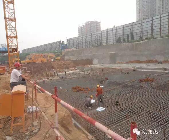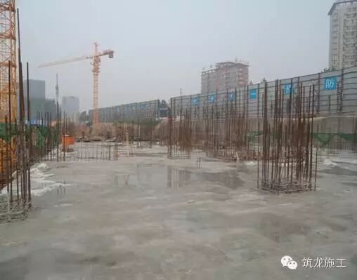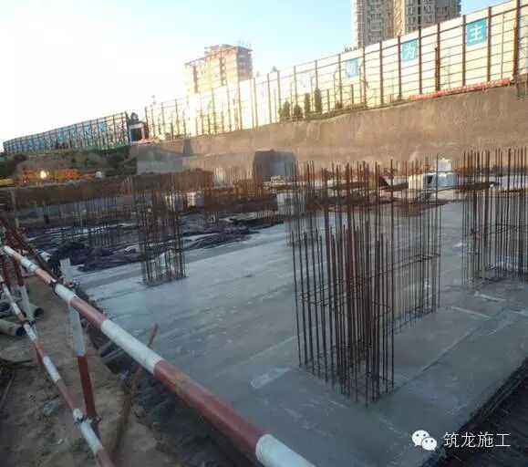 尤其注意:桩头防水应严格按设计要求施工确保与底板防水层整体一致,保护层施工完毕后,引定桩测设出筏板边线、剪力墙、柱子等位置(即基础放线,用红漆标示主要构件位置)。