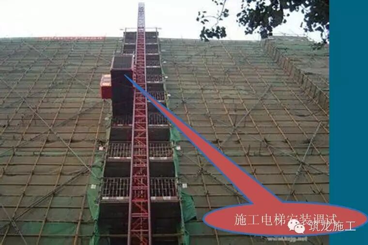 内墙抹灰完成开始施工,施工内容:设备进场验收,土建交接检验,驱动主机,导轨,门系统,轿厢,对重(平衡重),安全部件,悬挂装置,随行电缆,补偿装置,电气装置,整机安装验收等,参考工期50天。