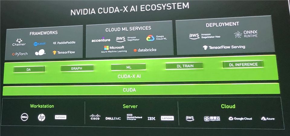 如今我们可以看到,英伟达已经在Cuda基础上开发和积累了针对不同领域的大量算法与软件,让数不清的开发者不用写一行代码,就能先让一套深度学习基础模型跑起来,站在巨人的肩膀上升级与优化软件堆栈。